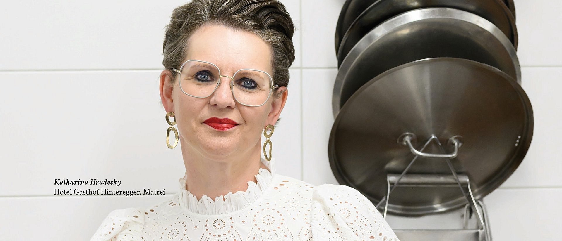 Ein wenig große weite Welt nach Osttirol zu bringen, ist eine der Triebfedern von Katharina Hradecky vom Hotel & Gasthof Hinteregger in Matrei. Schon als Kind hat die jetzige Hotelchefin gerne im eigenen Betrieb mitgearbeitet, bevor sie zur Ausbildung an die Wirtschaftsuniversität nach Wien ging. Nach einigen Jahren bei der Österreich Werbung in London stand für Katharina Hradecky fest, dass sie sich als weltoffene Gastgeberin am wohlsten fühlt. Vor nunmehr 20 Jahren hat sie den Betrieb von ihren Eltern übernommen und zusammen mit ihrem innovativen Mann Bernd mit dem „Gespür für die Region“ weiterentwickelt. Stolz und zufrieden blicken die beiden auf die eigene Biolandwirtschaft, die neben Milch und Rindfleisch für traditionelle Gerichte wie Tafelspitz & Zwiebelrostbraten auch Salat, Gemüse und Kräuter von Garten und Feld liefert. Ihre schönste Erfahrung ist aber immer noch das direkte Feedback der Gäste.